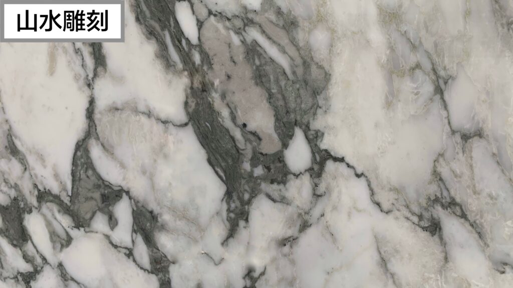 山水雕刻的特殊紋理猶如水墨畫般變化豐富,灰白的紋路與白色底色的碰撞呈現出極富藝術感的效果。這種石材深受喜歡個性化設計的業主喜愛,非常適合用於打造具有特色的空間,例如電視牆、餐廳背景牆等,讓家居更具個人風格和藝術氛圍。